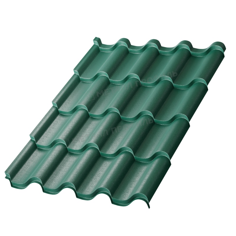 Металлочерепица Монтерроса-S толщиной 0,5 мм с покрытием VikingMP® E в оттенке RAL 6005 Зеленый мох представляет собой современный кровельный материал от компании Металл-Профиль. Это сочетание эстетики классической черепицы и прочности металла, идеально подходящее для крыш жилых домов, дач и коммерческих объектов. Покрытие обеспечивает долговечность, устойчивость к коррозии и привлекательный внешний вид, имитирующий природный мох.