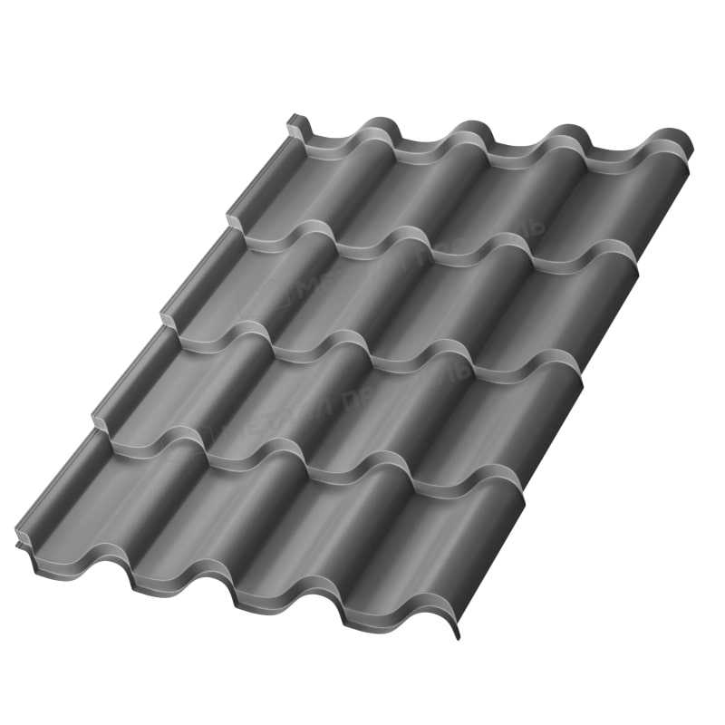 Профиль имитирует натуральную черепицу с выразительными волнами высотой 25 мм и шагом 350 мм. Такая геометрия обеспечивает отличную жесткость листа, предотвращая деформации под нагрузкой снега или ветра. Длина модуля адаптируется под индивидуальные размеры крыши, минимизируя отходы при монтаже. Профиль оптимизирован для быстрой установки с использованием саморезов, что снижает трудозатраты. В темно-сером исполнении он подчеркивает архитектурные формы, добавляя зданию элегантности без лишней вычурности.